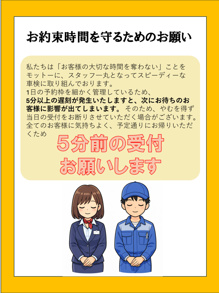 1日の予約枠を細かく管理しているため、5分以上の遅刻が発生いたしますと、次にお待ちのお客様の作業に影響が出てしまいます。